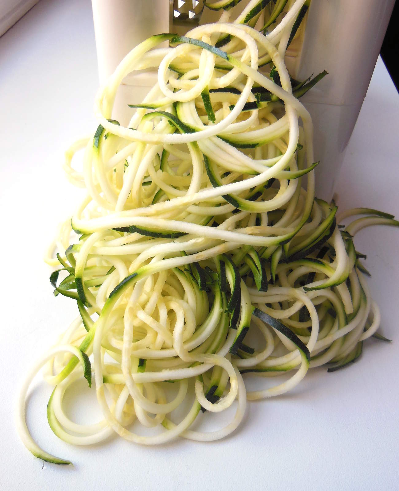 - Rinse and dry the zucchini. Slice off each rounded end and spiralize, using the thinnest attachment for spaghetti-like noodles. Use your hands to break the really long strands into two.