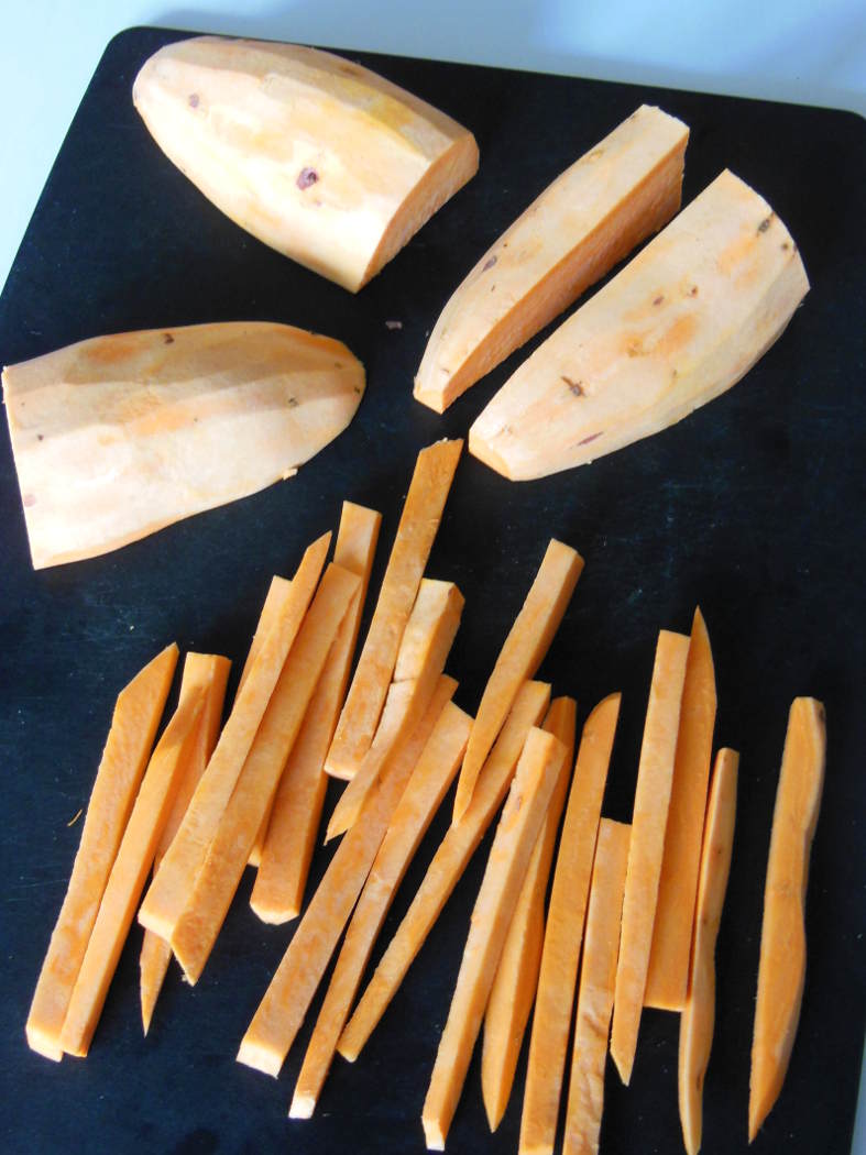 - Peel the potato and (carefully!) cut it into 1/4-inch wide sticks, making sure they’re as close to the same size as possible for even cooking. You may need to slice off some edges to even them out.