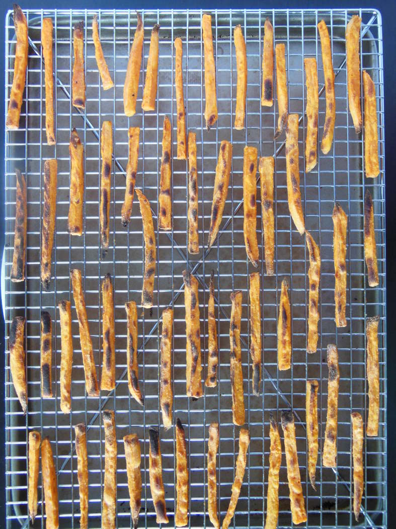 - Spread the fries in an even layer on top of the cooling rack. Make sure they’re evenly spaced - if the pan is too crowded, you’re better off baking them in batches. Bake at 400 F for 25-30 mins (if you're not using a cooling rack, flip them halfway). Then broil on high for about a minute, watching them closely. When they start to puff up and get slightly charred, they're done. Enjoy asap!