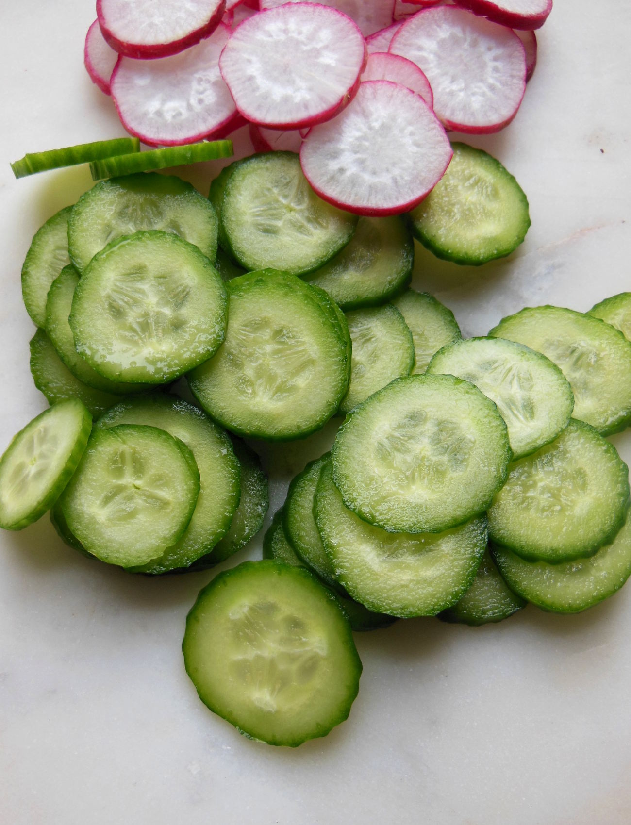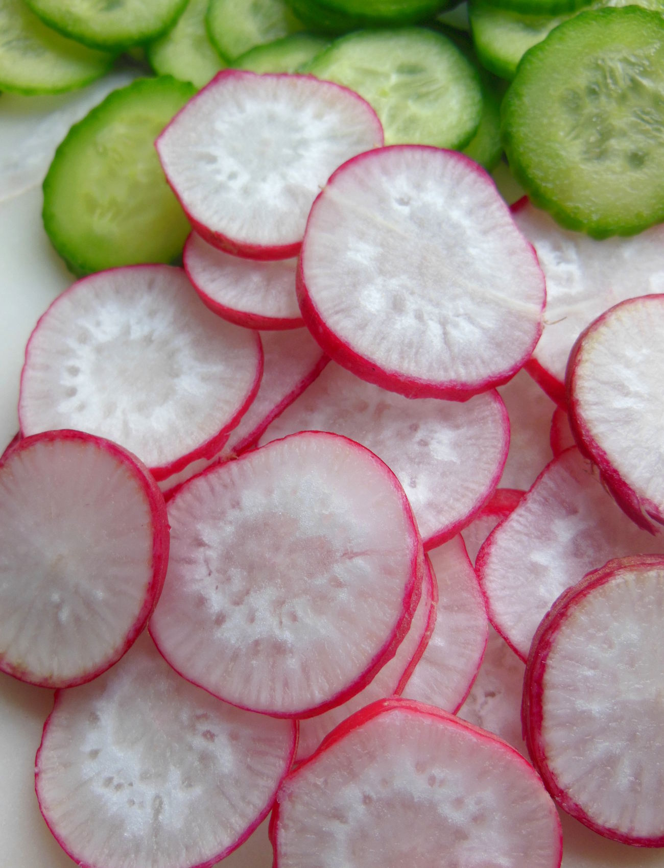 - ~1/2 pound vegetables* (I used 1/2 bunch radishes and 1 mini cucumber)